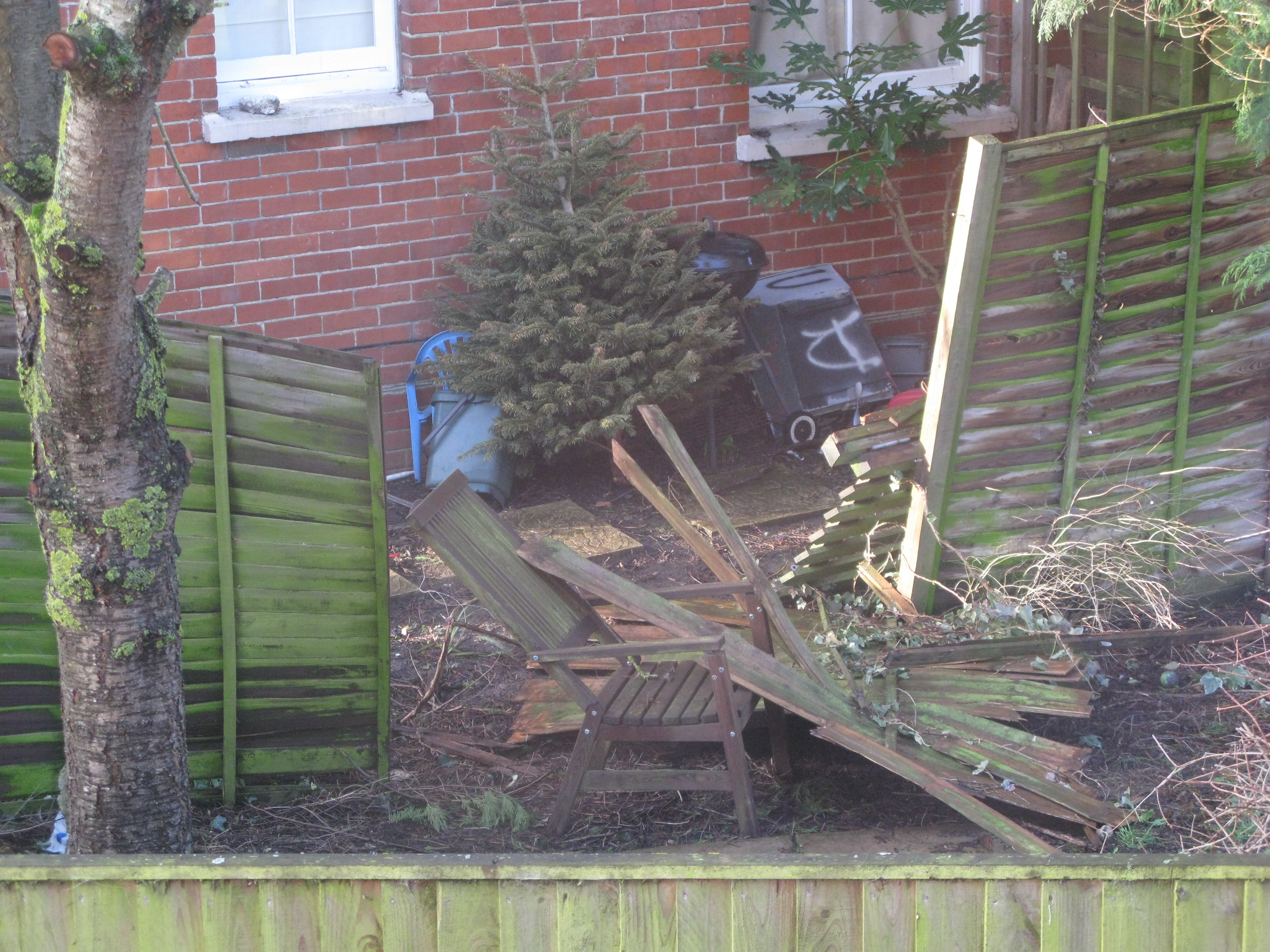 Som planerat har jag studerat engelska trädgårdar nu när vi är här. Från sovrummet har vi roat betraktat hur vinterns blåsiga väder påverkat våra grannars plank. En period var ett parti av planket uppe ett par dagar åt gången och sen nerblåst igen några dagar. Mot slutet hjälpte en trädgårdsstol att hålla uppe det hela, men nu verkar det vara kört.