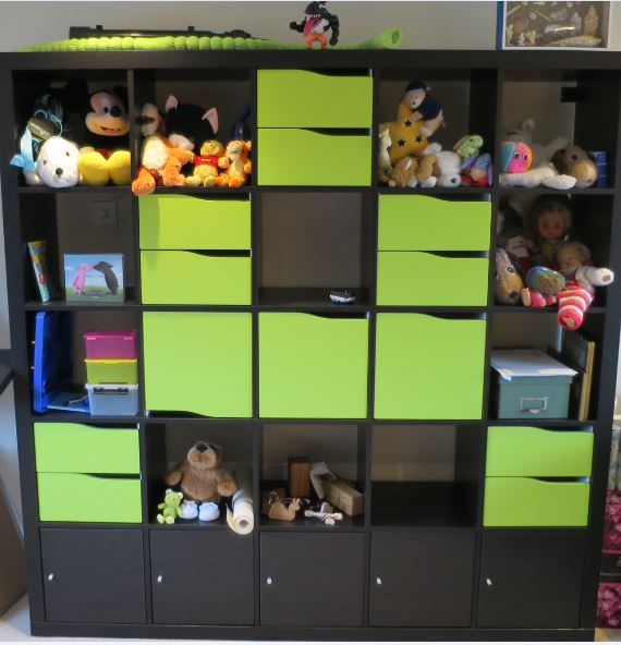 Hyllan vi hade i vardagsrummet på förra stället har fått lite käcka lådor och skåp. Den är numera nostalgi- och spel-hylla i spelrummet. Den med bra sikt kan hitta Js och mina gosedjur uppe i högra hörnet och notera våra identiska hundar!