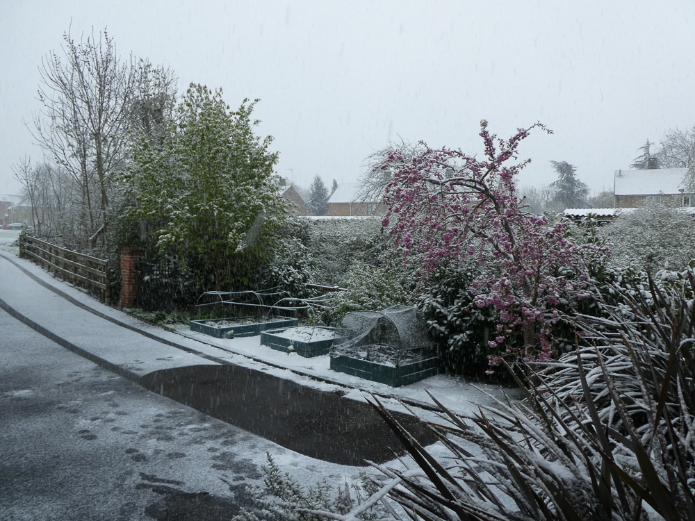 Idag av alla dagar så snöar det ymnigt på morgonen. De flesta andra dagar hade det inte spelat så stor roll, men idag ska takläggaren komma och fixa ett par trasiga takpannor. Dessutom är K och J på väg till London för att hämta sina nya pass. Jag plockade fram kameran, så här är en bild från när de just åkt, och sen några bilder tagna de senaste veckorna för kontrast.