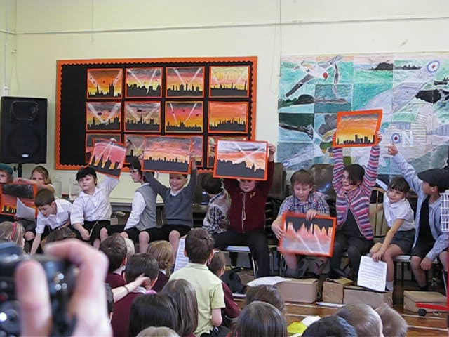 När alla satt sig började programmet med att en av eleverna hälsade välkommen. Sen turades de om att berätta om vad de lärt sig, visa bilder, läsa egna berättelser, spela teater, dansa och slutligen sjöng alla tillsammans. Mycket handlade om andra världskriget och om hur det var att vara barn då, men det var även ett drama om att hålla det man lovar. Allt var väldigt välgjort. Mot slutet var det A som reste sig upp och sa att de skulle sjunga en sång för oss. På engelska, inför nästan 200 personer! Modigt!