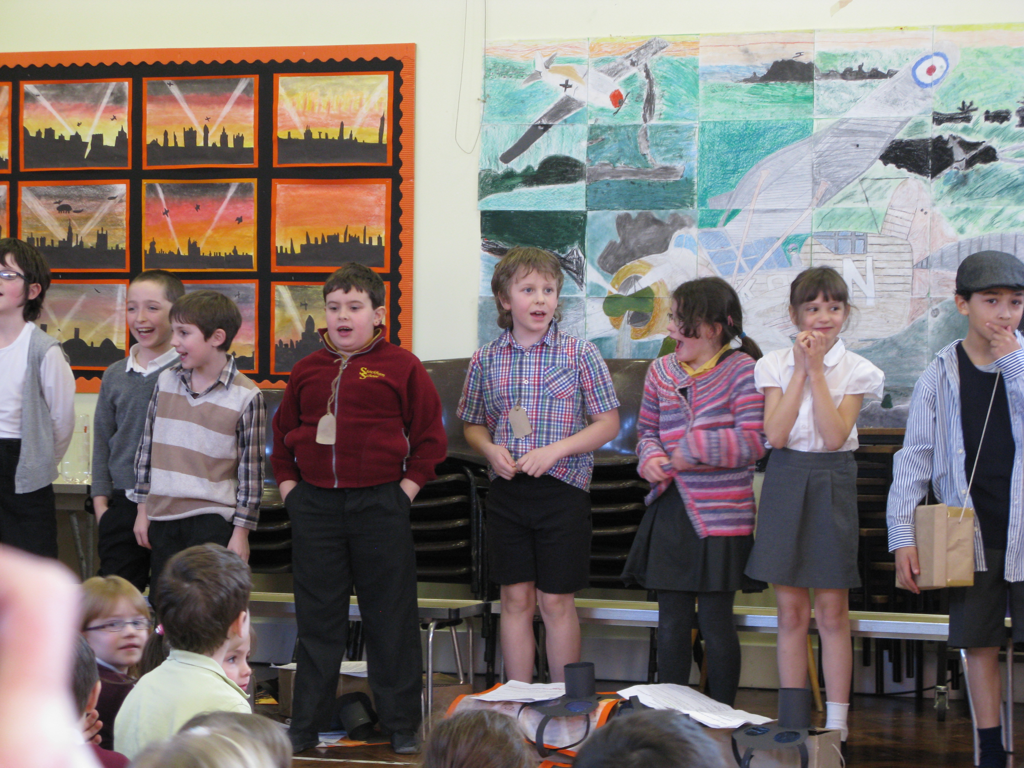 A går i fyran här (i Sverige går han i tvåan) och igår var det fyrorna som visade vad de lärt sig för hela skolan och för sina föräldrar. Föräldrarna fick sätta sig längst bak i gympa-samlings-mat-salen på bänkar. Sen kom eleverna in på led klassvis och satte sig på golvet framför. Fyrorna (knappt 30 stycken) satt redan längst fram på en lång rad med kläder på tema 1940-tal. Fyrorna hade dessutom varsin namnlapp i brun papp, en egen-tillverkad gasmask och en brun kartong till gasmasken.